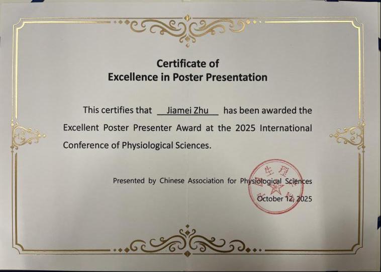 我校基础医学院生理学教研室2023级病理学与病理生理学专业博士朱佳美和2024级生理学硕士刘梦圆作为代表参加。朱佳美博士大会墙报展示论文《MEN1 Promotes Ferroptosis by Disrupting CD44 Alternative Splicing to Suppress Lung Cancer》得到与会专家及学者的关注和肯定,获评为优秀墙报。